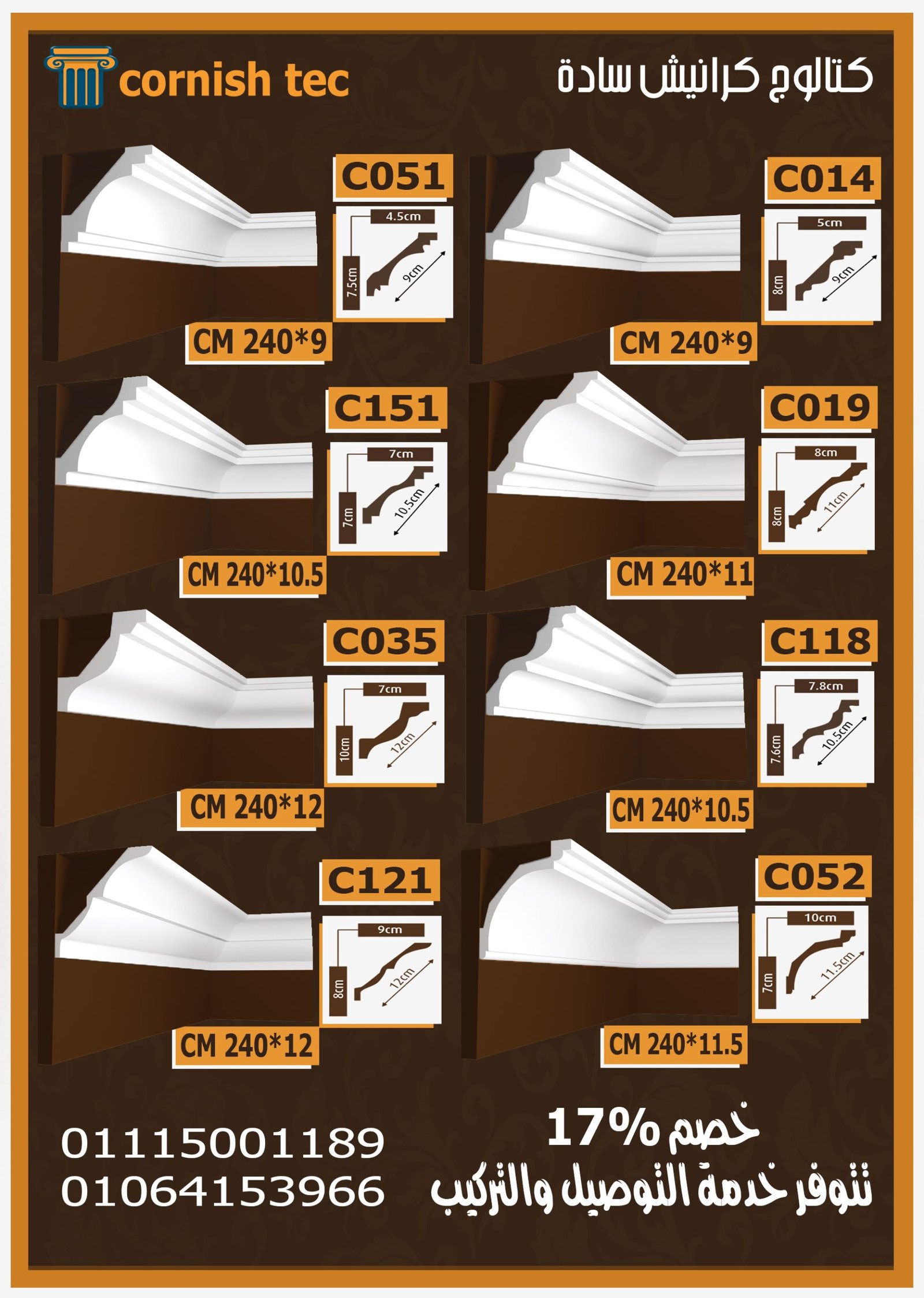 🔹 خصم حصري 17% دلوقتي تقدر تستفيد من خصم خاص بنسبة 17% على جميع تصميمات الكرانيش السادة، العرض متاح للمهندسين، شركات التشطيب، والعملاء الجدد. الكتالوج الجديد يضم نخبة من أجمل التصميمات المناسبة للمطابخ، الحمامات، الريسبشن، والممرات، بأحجام تبدأ من 4 سم حتى 24 سم.