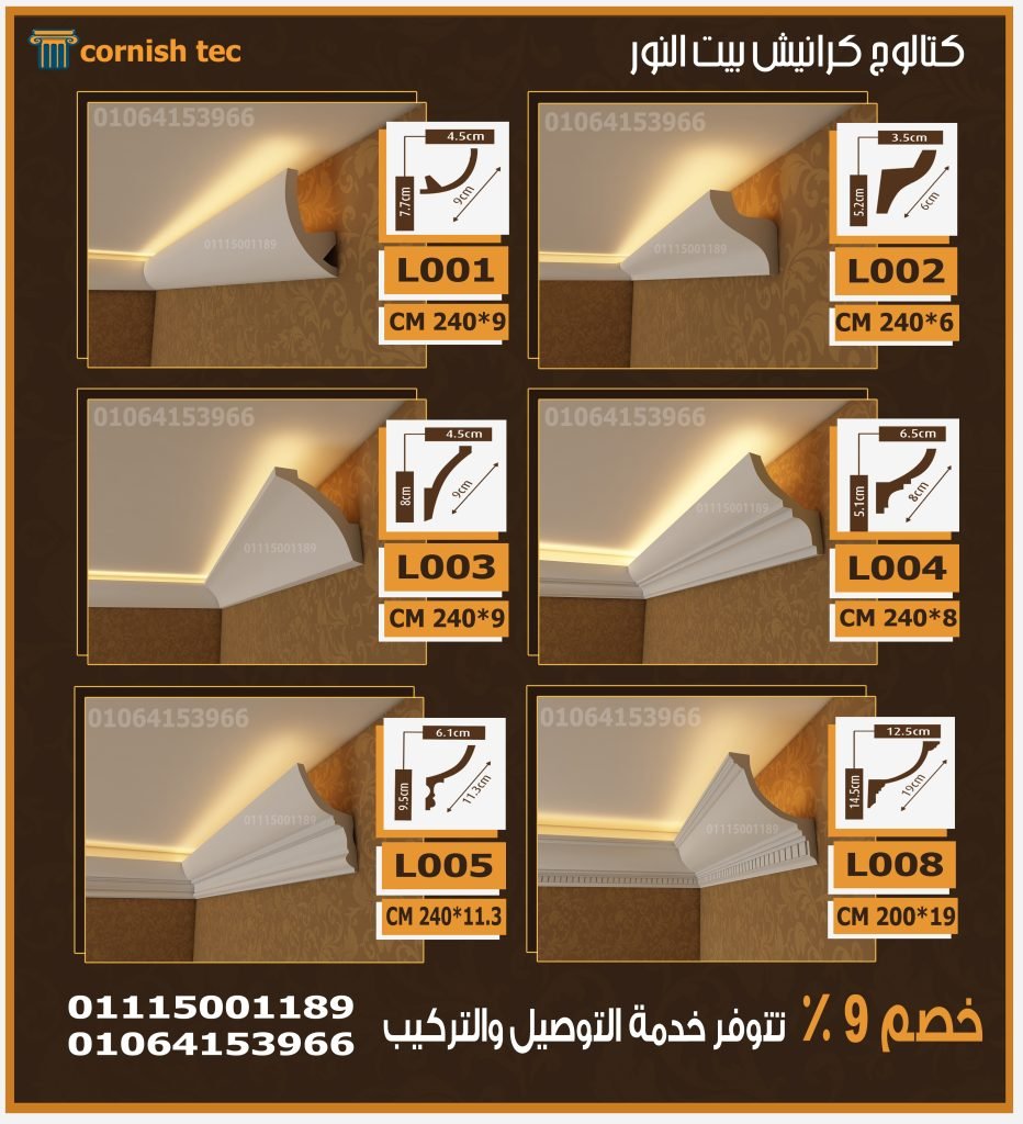 هي مصنوعة من الفوم المضغوط (البولي يوريثان فوم)، تُثبت على الجدران أو الأسقف لتشكيل تجويف يُستخدم لإخفاء شرائط الإضاءة LED. تُعرف أيضًا باسم “كرانيش الإضاءة المخفية” أو “كرانيش الإضاءة غير المباشرة”.